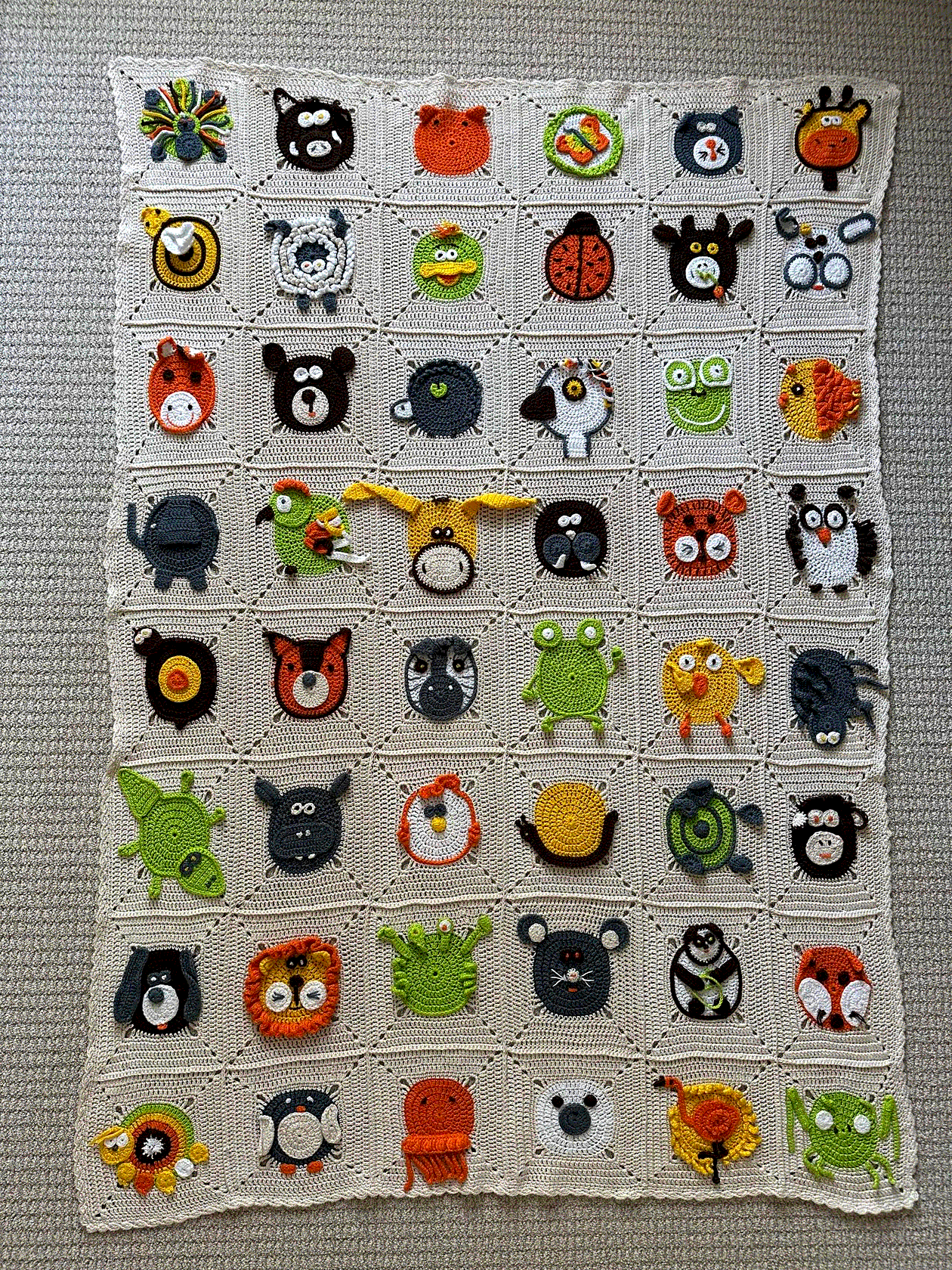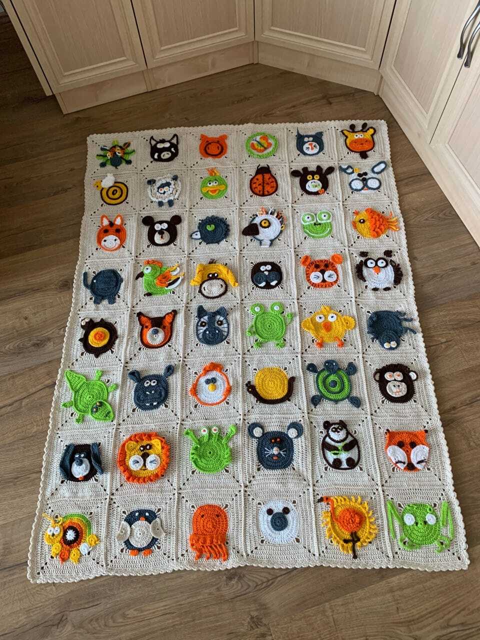 Захотелось внучке на годик что-то сделанное своими руками. Связала плед из 48 животных. Ни одно не повторяется. Внучка по нему изучала зверей. Связала ещё один - сыну. Брутальный, мужской, килограммов на четыре!